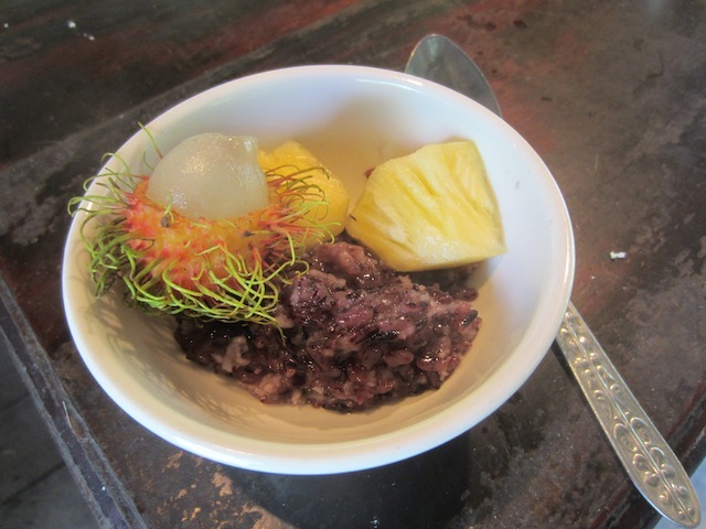 Dessert: purple sticky rice in reduced coconut milk with fresh fruit, sesame seeds and honey over the top, sprinkled with coconut.